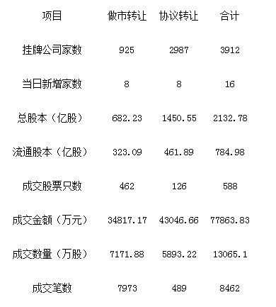 新三板掛牌公司周一新增16家至3912家,做市轉讓公司數量達925家,協議轉讓公司數量達2987家、周一新三板市場發生8462筆交易,共成交588只股票,交易金額達7.79億元,共成交1.31億股。