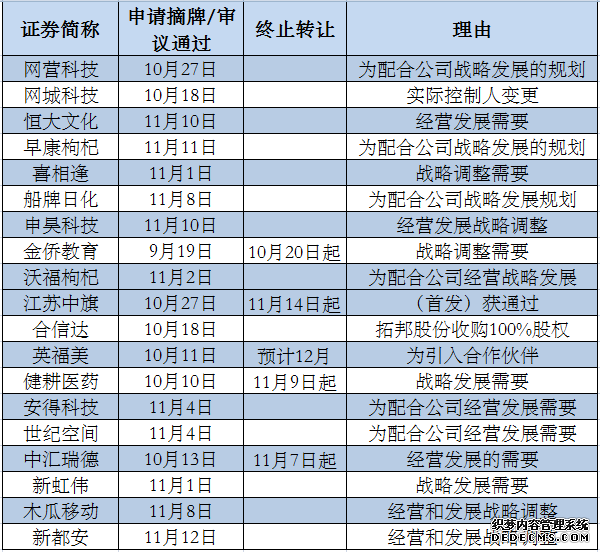 進(jìn)入10月份后,截止11月12日,19家新三板公司向股轉(zhuǎn)系統(tǒng)遞交了申請(qǐng)終止掛牌的材料,其中4家公司已完成退市,從申請(qǐng)獲受理到收到股轉(zhuǎn)同意函,平均用時(shí)不到一個(gè)月。